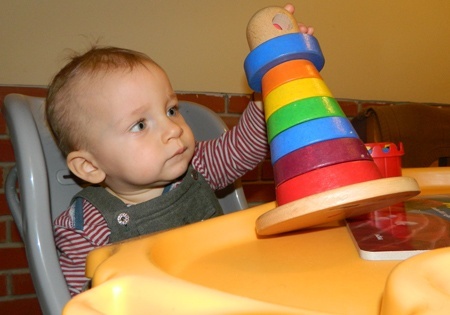Finom tej- és tojásmentes babatortát sütöttem neki az első szülinapra gesztenyés-banános krémmel. Az ajándékokkal kapcsolatban vitatható állásponton vagyunk a párommal: nem vettünk új játékokat, csak képeskönyveket, több okból is. Azt tartjuk – és látjuk is nap, mint nap – hogy a gyerekek kevés és egyszerű játékkal játszanak el a legjobban, ráadásul ez hagy igazán teret a fantáziájuknak: néhány kocka, labda, egyszerű fajáték szinte bármivé válhat a kezükben. (Persze ennél nekik is több játékuk van, de szeretnénk elkerülni a játékdömping közepén unatkozó gyerekeket, több-kevesebb sikerrel.)
