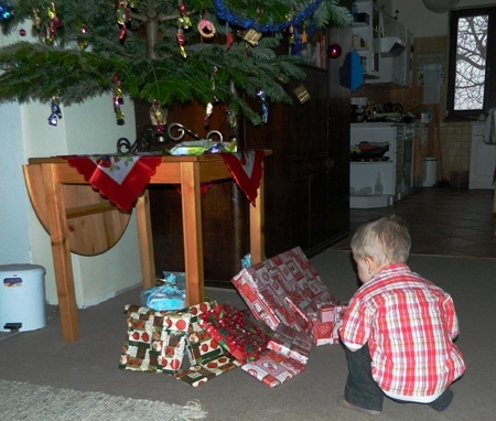 Aztán eltelt néhány nap, és a két héttel ezelőtti Csongornaplóban megírt szorongásom ellenére lett bejgli, mézeskalács, aprósütemény, tiszta lakás, még fodrásznál is voltam, és az ünnepi ebéddel-vacsorával is előre tudtam dolgozni annyira, hogy Szenteste már csak néhány apró simítás erejéig kellett a konyhában tartózkodnom. Marci éves váltásban tölti az ünnepet hol itthon, hol az apjáéknál, most éppen ott volt, úgyhogy csak két kicsi tágra nyílt szemeit és örömét csodálhattuk.