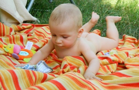 Mit is meséljek a kis nyolchónaposomról... A mozgalmas napok zűrzavara közben ő a biztos pont, és neki én, ő az, aki mindig itt van és mindig aranyos. Nagyon sokat fejlődött a konduktornál tett látogatásunk óta: ugyan még mindig nem ül, nem áll és nem mászik, de forogva-gurulva, a hasán körbefordulva bejárja a környéket, szerintem a kúszás sincs messze. Most már nincs megállás, és el is kezdődött a „Csongor, neeee!” korszak Regő életében, mert a kicsi mindent elér, és mindig pont az tetszik neki, amivel ő játszik.
