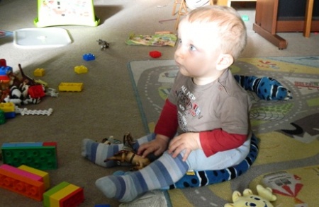 Csongor jelenleg kilenc kiló, 74 centi, nyolc fog büszke tulajdonosa, az utolsót épp a hófordulója körül növesztette ki. És már nem mondhatom, hogy nem ül, nem áll és nem mászik, ugyanis már néhány hete felült támaszkodva, és az egyik reggel a mi ágyunkban óriási erőfeszítéssel, hol húzva, hol tolva magát, támaszkodás nélkül is felült mellettem. Nagyon figyeltem, hogy ez csak véletlen eset volt-e nála, de most már olyan rutinosan, ügyesen felül, ülve játszik és tapsol, hogy most már egész nyugodtan elmondhatom róla: bekövetkezett a nagy áttörés a mozgásfejlődésben: Csongor felült.