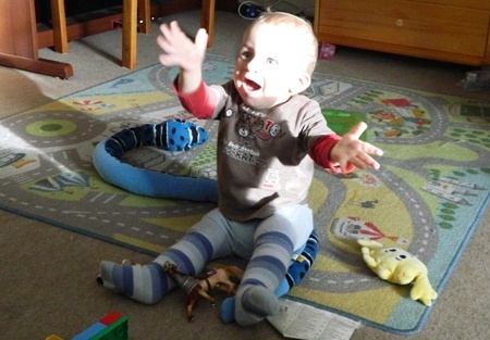 Szóval most a mozgás a legnagyobb attrakció nálunk, de azért tud még egyet s mást ez a kilenc hónapos: tapsolni, magát hintáztatni, kis felelgetős játékokat játszani és a környezetét egy-egy mosollyal elvarázsolni. Integetni még nem, tanítgatjuk, mutatjuk sokat, de még nem állt össze neki a kép, hogy mit is várunk tőle.
