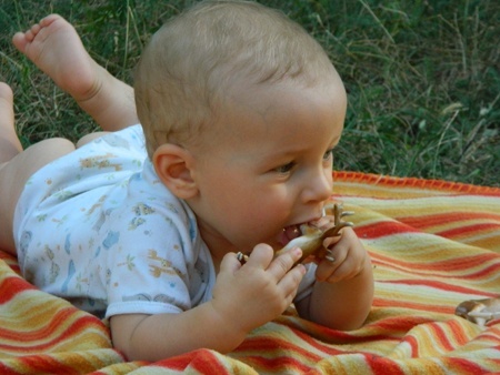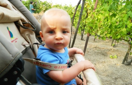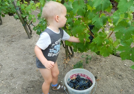 Szőlőt szüreteltünk. Igen gyér az idei termés a kertben, gyümölcs alig volt, zöldségből is épp csak, amit frissen el tudtunk fogyasztani, nem szerette a kert a húsvéti fagyot és a forró, száraz nyarat. De szőlő legalább van! Két kis munkással vágtunk neki, az egyik büszkén tépte, vágta a fürtöket, halmozta vödörbe és szállította a mamának... Izé, a szőlőtisztító segédmunkásnak.
