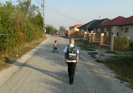 Harmatos reggel, rövidnadrágos, de azért csípős. Előttem a fiúk: egy ünneplős iskolatáskás, egy biciklis-sisakos, egy babakocsis. Utóbbi járműve rajzdobozzal, tisztasági csomaggal ellensúlyozva. Évnyitóra megyünk. Bennem a drukk: vajon hogy bírják a kicsik, és mennyire dúlják fel önfeledt kurjongatásukkal a fennkölt perceket? Csőre töltött telefon a táskámban, a másik végén egy riadóztatható nagymama. És az öröm: nem volt rá szükség. Regőnek voltak hangosabb percei, de csak egy háromévestől elfogadható mértékben, Csongor meg édes volt nagyon.