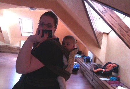Mielőtt ezt kiszúrtam épp azt akartam írni, hogy mennyire jó hordozni, és hogy a baba és az anyuka együtt-mozgása még jobb, így múlt héten kipróbáltuk a mamás-babás latin fitneszt… Hát, ha Koppányra figyelek – és ezt teszem, mert kiköveteli – akkor egy mozdulat sem sikerül úgy, ahogy kellene. Egy sem! Szóval a torna végére megjegyeztek minket: Koppit azért, mert ő volt az egyetlen, aki a torna első 10 percében, a bemelegítés alatt, úgy döntött, hogy elege van – túl hamar raktam a hátamra –, engem meg az abszolút koreográfia-ellenes ügyeskedésem miatt. De megyünk máskor is, saját csatos hurcival csak egyszerűbb lesz. Így már akkor kapom fel és rakom le Koppit amikor csak akarom.