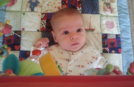 Egy kedves olvasóm kérte, hogy írjak a mozgásfejlődésről, amire azt válaszoltam, hogy nincs mit, hiszen Micó még nem nagyon csinál semmit. Aztán rájöttem, milyen igazságtalan voltam. Ugyan még nem forog, de nem sok hiányzik, egészen fél oldalra tud fordulni, sokszor szinte kiflivé változva forgatja a fejét a hang irányába. Csodálatosan, kiemelve tartja a fejét, akár tíz-tizenkét másodpercig. A kis kezével ügyesen megüti a lelógó tárgyakat, és a múltkor, mikor egy könnyű kis csörgőkarikát adtam a kezébe, azt is ügyesen megtartotta. A lábait felváltva húzogatja, így édesen jár keze-lába, mikor a játszószőnyeg vagy a babatornáztató alatt fekszik. Szépen játszik a hangjával is, eddig csak magánhangzókat kiáltott, most már hosszan, bugyborékolva gagyog, szinte beszélget. Okosan ráncolja a homlokát, összehúzza a szemöldökét, hihetetlen élő az arca, beszédes a mimikája.