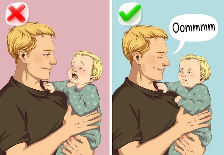 Az „omm”, a „hhmm” és a „pszt” hangok használata segíthet a kicsi megnyugtatásában, mert úgy hangozhatnak számára, mint az anyaméhben keringő vér. Ajánlott percenként körülbelül 80-szor megismételni őket (ez megegyezik a felnőtt átlagos pulzusszámával).
