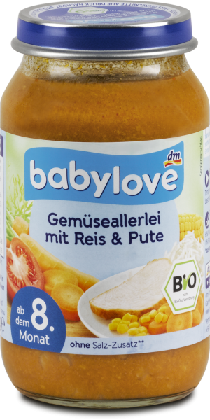 Az ízletes dm babylove bébimenü 51% zöldséggel, rizzsel, valamint finom pulykahússal készült, és valamennyi összetevője ellenőrzött ökológiai gazdálkodásból származik.