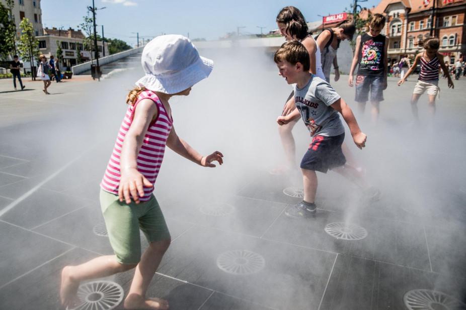 Gyerekek hűsítik magukat egy szökőkútnál a kánikulában Budapesten, a Széll Kálmán téren 2016. június 23-án