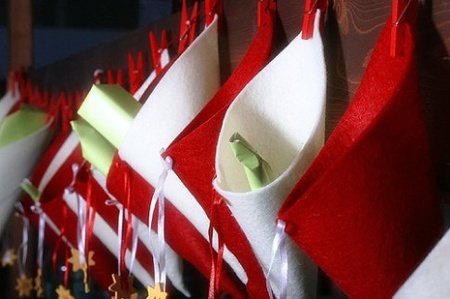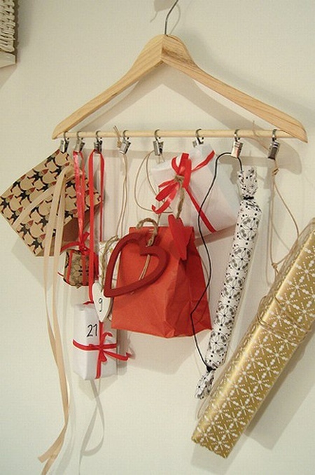 Ehhez a naptárhoz elég gyerekenként két fogas és 24 függönycsipesz – meg persze 24 becsomagolt ajándékcsomag. Ajánljuk azoknak, akik úgy érzik, nem elég a kézügyességük egy szabást-varrást megkívánó projekthez, hiszen elég hozzá, ha csomagolni tud az ember.