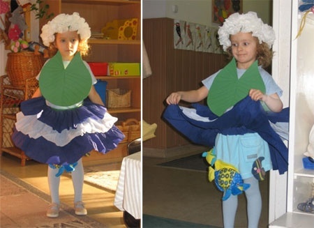 Következő alkalommal abban állapodtunk meg, hogy tavirózsa lesz a gyerek. A jelmezhez felhasználtuk a babakori forgójáról a textilhalakat, csináltunk krepp papírból szoknyát, zsebkendőből fejdíszt, és így azt is meg tudtuk mutatni, hogy a tavirózsa víz felszínén fekvő levele alatt mi lehet.