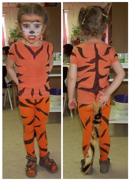 Az első jelmezünk ez a tigris volt. Varrni nem tudok – géppel semmiképp -, úgyhogy olyasmiben kellett gondolkodnom, ami enélkül is megoldható. Volt a szekrényben elfekvőben egy narancssárga póló és harisnya, így már csak egy fekete textilfilc kellett meg némi műszőrme. A műszőrméből farok lett – ezt kézzel varrtam meg és tömtem ki -, a fekete filccel pedig rárajzoltam a csíkokat a többi részre. Aztán reggel az oviban még felkentem a gyerek izgatott pofijára egy kis festéket, a hajából készítettem füleket, és már ment is lemorogni és levicsorogni a csoporttársakat.