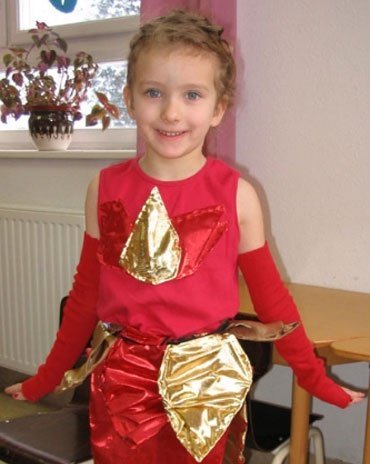 A harmadik farsangra a gyerek kitalálta, hogy ő akar lenni a tűz. Varrni tudás nélkül komoly kihívásnak ígérkezett a feladat, de aztán végül megúsztam némi pillanatragasztózással, drótozással. Egy régi harisnyából vágtam kesztyűt, ismét egy régi póló vált áldozattá, a szoknya gumiból, drótokból és többféle anyagból készült – na, utóbbihoz kellett a pillanatragasztó is. Igazából a szoknyai lángnyelvei felfelé kellene, hogy álljanak, nézzétek el nekem, konstrukciós hiba.