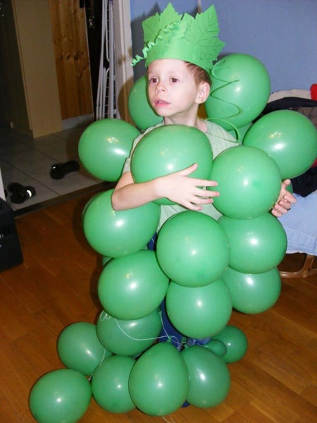 Orsolya kisfia kétszeresen is örült az anyukája által készített jelmeznek. A szőlő az óvodai jele és egyben a kedvenc gyümölcse is. Mi is kell hozzá? Némi zöld karton és sok zöld lufi – meg egy erős tüdő!