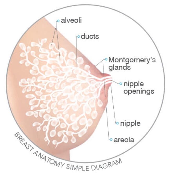 3. A szívás szintén kiváltja az oxitocin felszabadulását – ez egy másik hormon, amely a laktációért felelős. Stimulálja a sejtek összehúzódását a bimbóudvarban és a tej kilövellését a tejcsatornákba (úgyn. oxitocin reflex, kiválasztás). A tej a tejcsatornákba kerül a mellbimbóba, a baba szája felé.