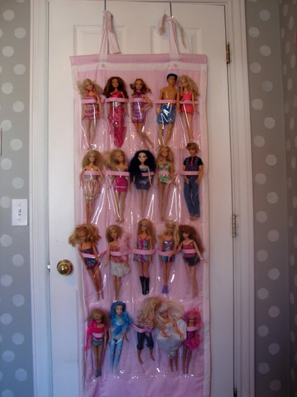 Eddig ez az egyik legfrappánsabb ötlet, amit valaha akasztós cipőtároló hasznosítására láttam. Persze nem csak Barbie-kat lehet benne tartani, mehetnek bele plüssök, akciófigurák, kocsik is, ha úgy tetszik. Helyet is spórolunk vele, ha az ajtóra akasztjuk és jól is néz ki. |