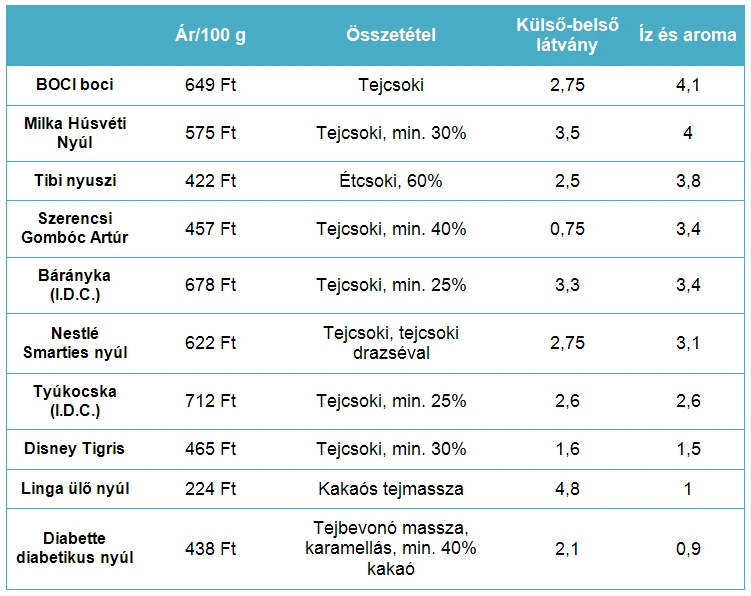 Végezetük pedig álljon itt ismét egy táblázat a legfontosabbakkal: ár, összetétel, és a pontozás. Ezúttal is külön pontoztuk a látványt, és az ízt, ki-ki döntse el, melyik a fontos. Mi most az utóbbi szerint rendeztük a sorrendet, higgyétek el, ennyi kóstolás után már csak az íz számít.