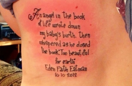 Ez a szülő nemcsak gyermeke nevét és születési dátumát örökítette meg magán tintával, de egy érzelmes gondolattal is kiegészíttette.