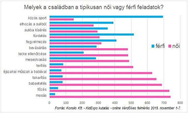 A válaszokból kiderül, hogy a magyar apukákra leginkább a sportolásban, a fegyelmezésben és a fürdetésben számítunk, míg az anyukák hagyományosan a háztartásban, és a kapcsolódó házimunkákban kell helytálljanak. Meseolvasásra a megkérdezettek szerint a férfiak is alkalmasak, ugyanakkor teríteni, főzni, mosást berakni, vagy felkelni éjszaka egy baba kedvéért nem igazán. Kevesebb mint a megkérdezettek tizede jelölte meg ezeket lehetséges férfi szerepekként.