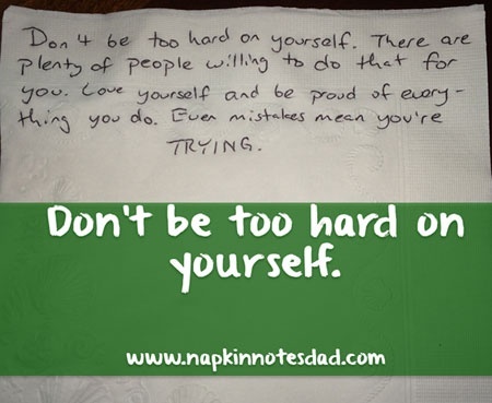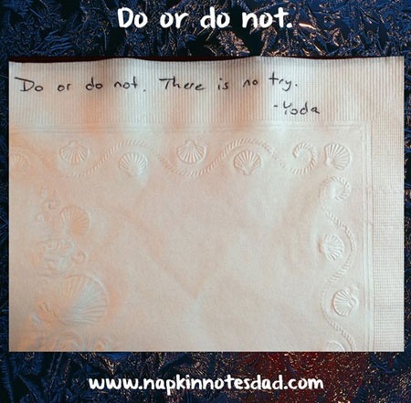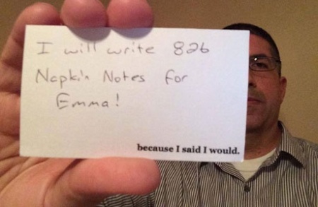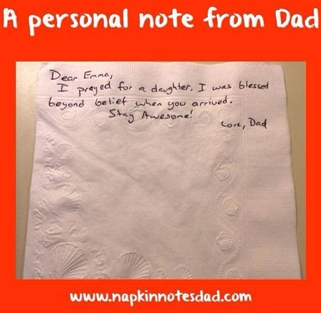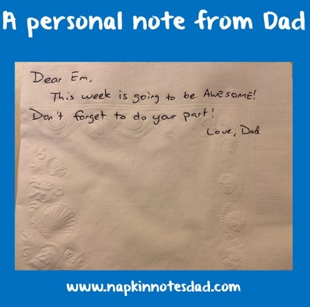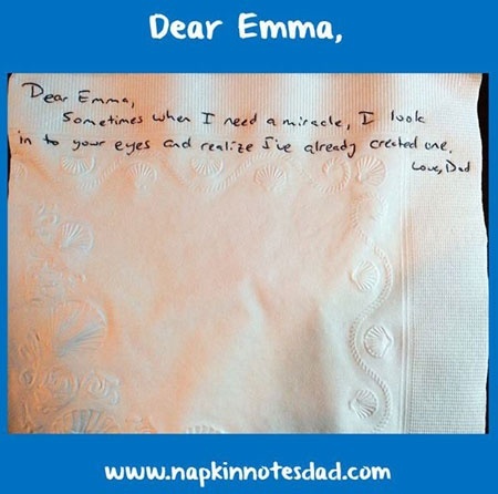 Ezért elhatározta, hogy üzeneteket hagy lányának egy-egy szalvétára írva – vagy egy őt inspiráló idézettel vagy a saját intelmeivel. Mondjuk, ezek az üzenetek náluk nem számítanak újdonságnak: az édesapa már azóta ír valami elgondolkodtató vagy szeretettel teli üzenetet a lánya szalvétáira, mióta az óvodába kezdett járni. A szeretettel átitatott szalvéták ott várták Emmát mindennap az uzsonnás dobozban.