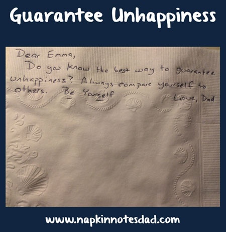 "Drága Emma! Tudod mi a legjobb módja, hogy garantáltan boldogtalan legyél? Hasonlítsd magad mindig másokhoz. Légy önmagad. Szeretettel, Apa"