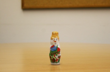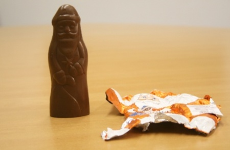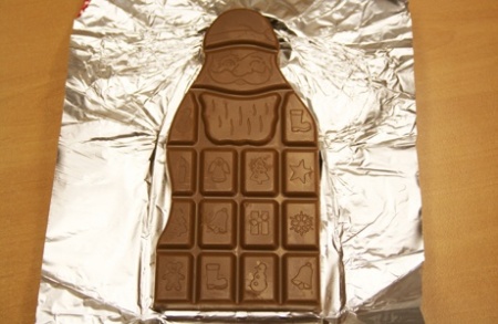 Kibontva a Mikulás a vártnál szebben-jobban kidolgozott, bár kissé nagy a különbség a külső és a belső arculat között. Nem tudtuk eldönteni, hogy egy kerti törpével vagy magával a pápával állunk-e szemben. A finom fehér réteg az amúgy túl sötét csokoládén nem volt valami bizalomgerjesztő és az illata is olyan, mintha régi lenne. Kb. 60 centis magasságból oldalra ejtve nem törik, azonban a fejére ejtve az ominózus testrész gond nélkül elválik a nyaktól – méghozzá szilánkosan.