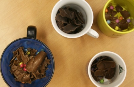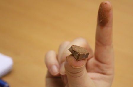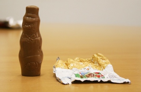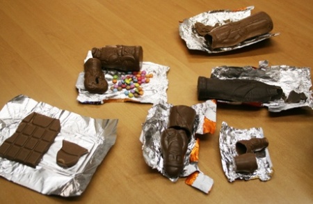 Végül elvégeztünk egy olvadástesztet: Egy kis darab csokit két ujjunk közé szorítva azt próbáltuk tesztelni, hogy a gyereknek van-e ideje elnyammogni, vagy idő előtt a tenyerébe olvad. A sárgabarackos olvadt meg legelőször, majd a rénszarvas adta meg magad, a hóember pedig minden előzetes figyelmeztetés nélkül eltörött. A diabetikus is olvadt azért, a Milka a vastagsága miatt sokkal később jutott el a ruhába kenhető állapotba. A Linga egyáltalán nem olvadt… ez azért furcsa. Pedig tutira gépzsír.