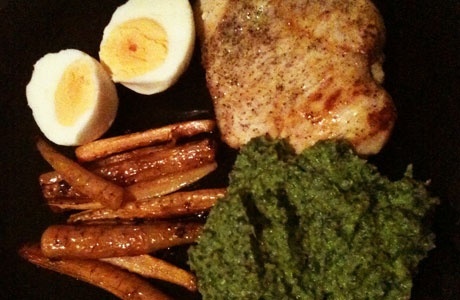 Grillezett vagy sült csirkemell, zöldszósszal és párolt sárgarépával, esetleg főtt tojással (sok benne a B12-vitamin)