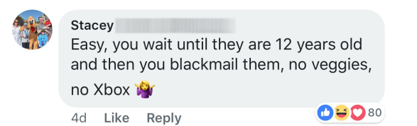 - Hát ez az anyuka nem viccel (vagy inkább mégis csak viccnek szánta!?): „Várd meg, míg 12 éves kiskamasz lesz, akkor már megzsarolhatod azzal, hogy ha nem eszik zöldségeket, az Xboxszal sem játszhat”