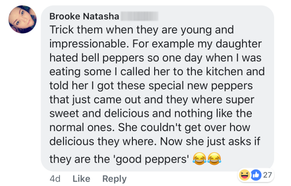 - „Trükkösen kell megszerettetni velük a zöldségeket: akkor, amikor még kicsik és könnyen befolyásolhatók. Az én lányom például utálta a kaliforniai paprikát, egészen addig, míg egy nap azzal állítottam haza, hogy most egy különlegesen édes és finom fajtát vettem, egy egészen új változatát a paprikának. Azóta mindig azt kérdezi, mikor látja, hogy egy kalifornai paprikát szeletelek, hogy „ez az a különleges fajta?!” és persze kér is belőle.” - Hm.. mesélj már többet erről a módszerről, mégis hogyan tudtad így átverni a kicsit?! (Egyébként nekünk a spenót és a Popey-i erő kapcsán ez tényleg bejött: akkor leszel erős, ha ezt megeszed!)