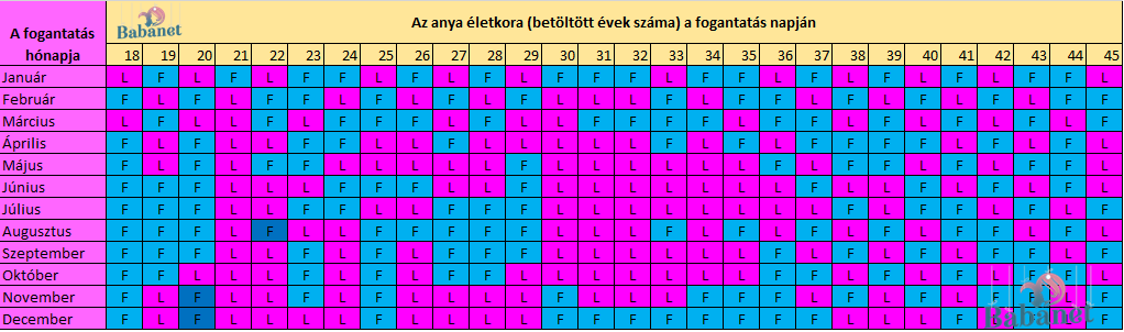 Hogyan használd? Bal oldalon válaszd ki a baba fogantatásának hónapját, majd a felső sorban, az életkor oszlopból pedig a saját életkorodat a fogantatás napján. A két kiválasztott oszlop metszéspontjában lévő cellában beírt betű a megfogant gyermek nemét mutatja meg. Az L betű lányt, az F betű pedig fiút jelenti.