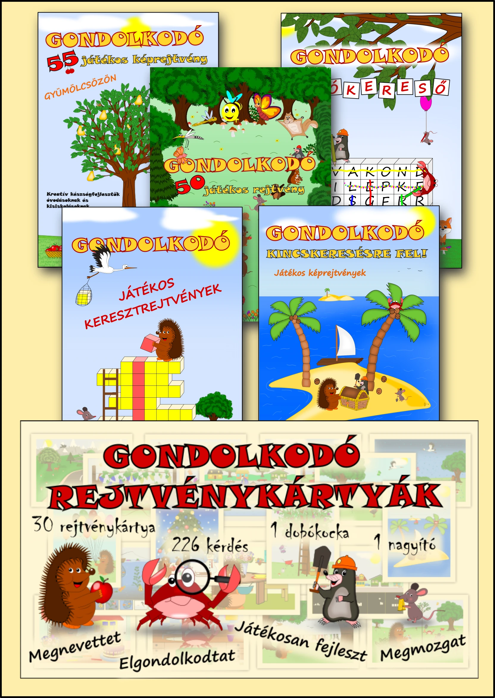 Továbbá érdemes beszerezni a Gondolkodó rejtvénykártya csomagot, mely 30 kártyából, 226 kérdésből, 1 dobókockából és egy nagyítóból áll, hogy valóban játék legyen a rejtvényfejtés. A feladványok elgondolkodtatnak, megnevettetnek, megmozgatnak és közben játékosan fejlesztenek.