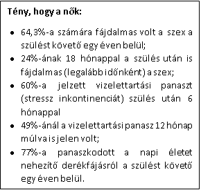 Dr. Pácsa Szilvia elmondása szerint „az anyai halálozáson kívül nem található nyilvános magyar adat a szülés során elszenvedett anyai sérülésekre vonatkozóan. Nagyon valószínű azonban, hogy a magyar nők körében legalább olyan gyakori a szülés utáni kismedencei panaszok száma, mint Európa más országaiban. Csak nem vizsgáljuk, nem foglalkozunk vele.”