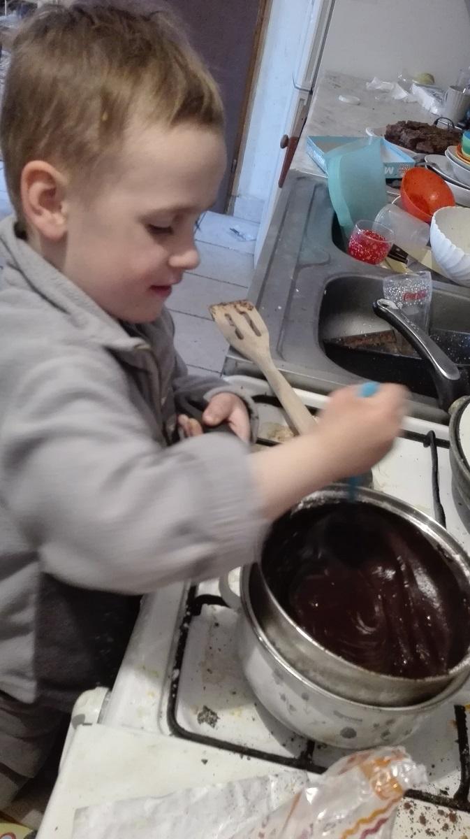 Gyorsan felmérem a helyzetet,hogy sajnos nincs időm órákon át pepecselni a tortával, de azért meglepiből csak sikerül összedobnom egy egyszerű Sacher tortát, mindezt úgy, hogy a férjem dolgozik, a lányom nyűgös, a fiúk segíteni akarnak, a szüleim a szomszédban vannak, ráadásképpen a vesekövem is pont ezen a hétvégén akar elhagyni engem, ami piszok fájdalmas és még a tortakarikám is anyukám szekrényében tartózkodik, így le kell mondjak a kerek tortáról. De nem baj, megéri a fáradtságot az én klassz családom!