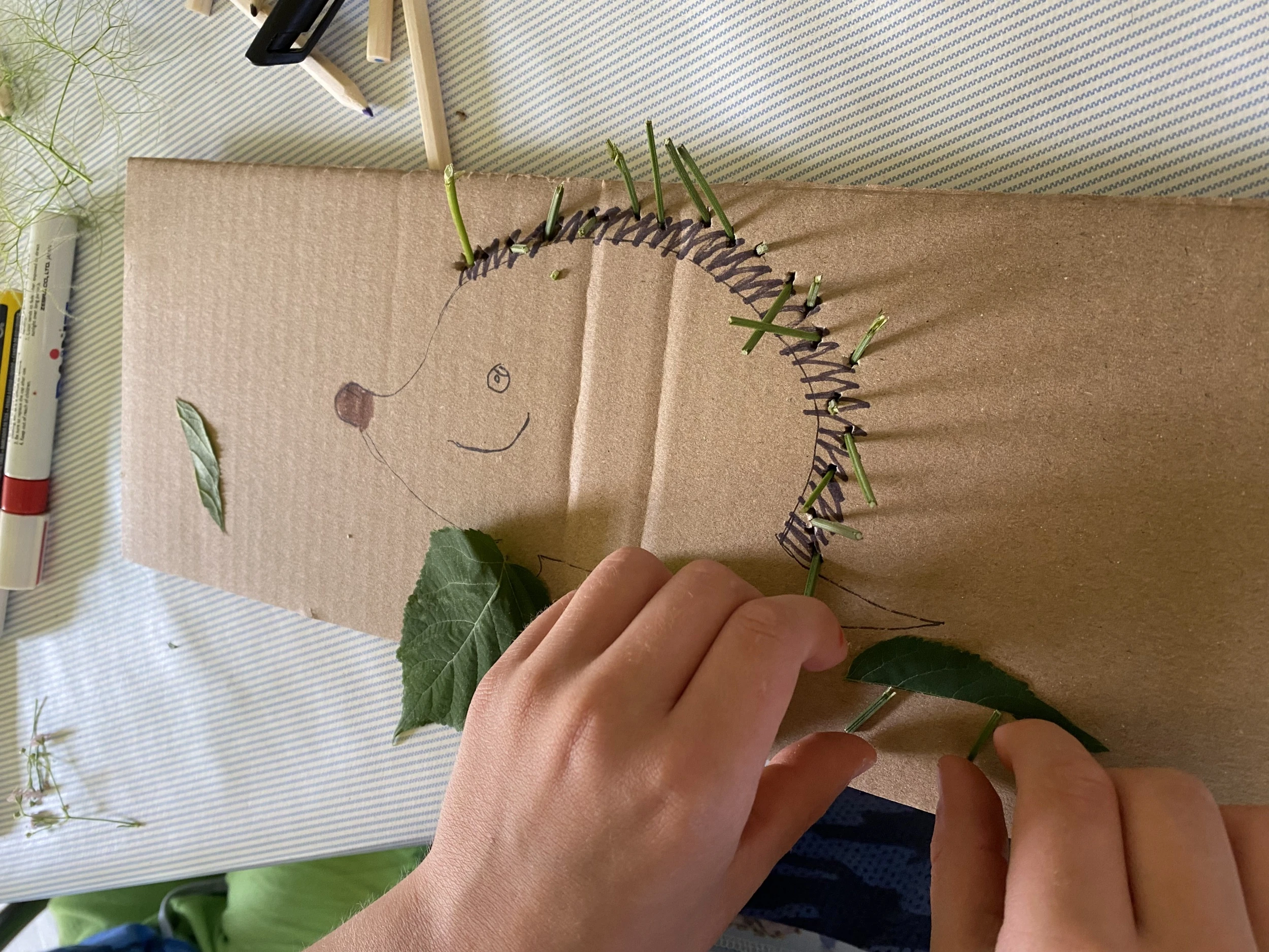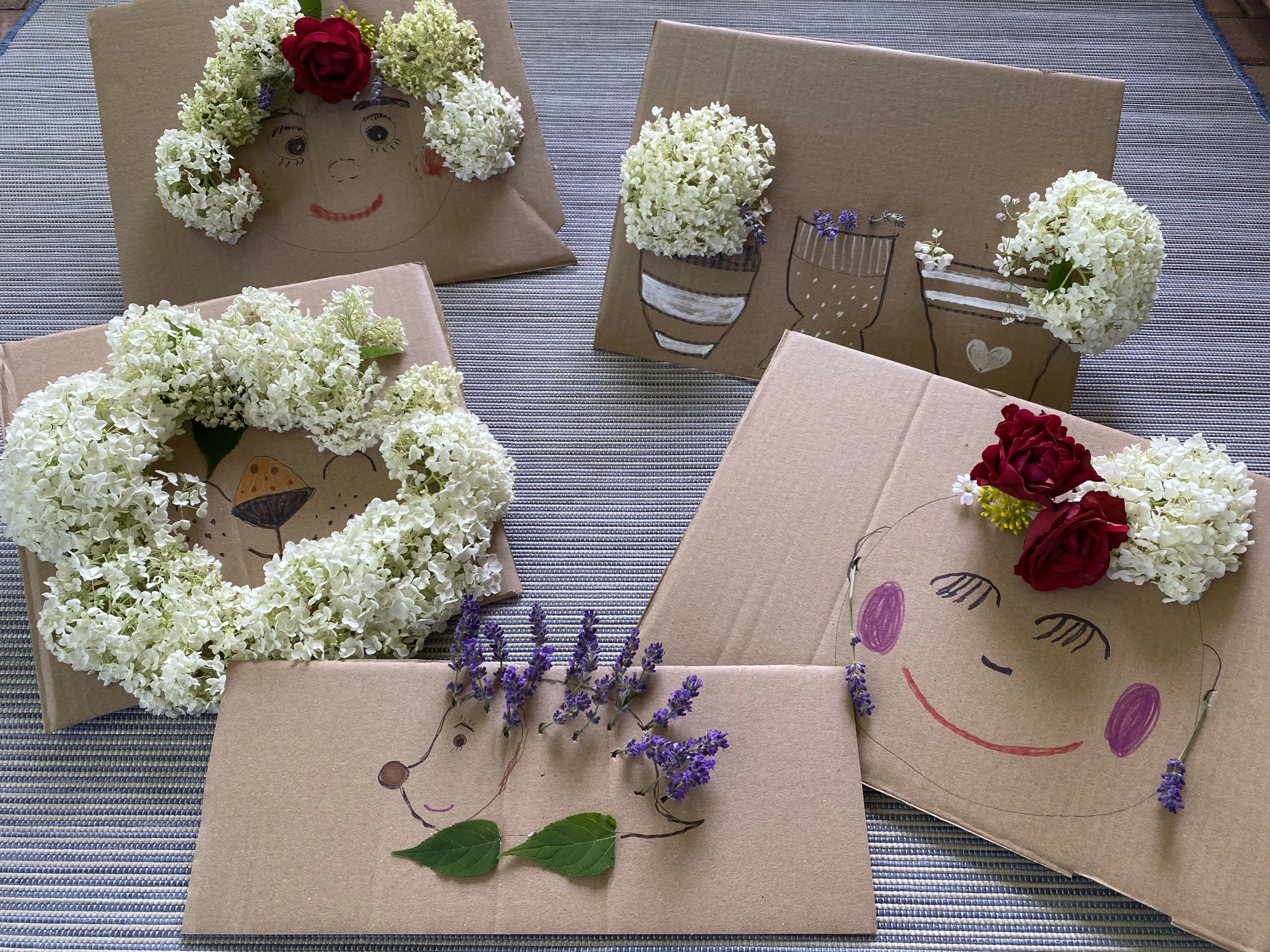 Én most a kertünkből szedtem idénynövényeket a projekthez: hortenziát, levendulát, rózsát, valamint apró sziklakerti növényeket, és két szomszéd fiú, Ádám és Dávid voltak a segítségemre abban, hogy minél változatosabb művek készülhessenek. A képeket nézegetve látni fogjátok, hogy a rajzoknak csak a fantázia szabhat határt, aki pedig magától nem tud figurákat rajzolni, azoknak ajánlom a Pinterestet, ahonnan számtalan sablont le lehet másolni.