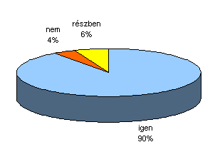 Az apák leginkább azért nem jártak felkészítõre, mert párjuk sem (84%). Azokban az esetekben, ahol az anya résztvett, de az apa nem az indokok a következõk voltak: 1. idõhiány (9%) 2. nõi dolog (3% 3. nem érdeklik a részletek, távol tartja magát (2%) 4. otthon készül(1%) 5. elváltak(1%) Az a tény, hogy az apák örültek-e a gyermek érkezésének, vagy csak elfogadták a helyzetet kevésbé befolyásolta a felkészítõ foglalkozásokon való részvételi kedvüket, mint korábban gondoltam. Bár csekély mértékben magasabb volt a részvételi arány azoknak a férfiaknak a körében akik örültek párjuk terhességének, látványos különbség nem mutatkozott. (örült 33%, elfogadta 25%) Annak a kérdésnek a kapcsán, hogy mennyire segítették a felkészítõn szerzett információk a szülõnõt a vajúdás, illetve szülés ideje alatt, a legtöbben az arany középutat választották. A megkérdezettek 30%-a választotta a felkínált számskálán a középsõ értéket. 23% nyilatkozott teljesen pozitívan, számukra nagy segítségül szolgáltak a kapott információk és csak nagyon kevesen, a válaszolók 7%-a nyilatkozott úgy, hogy egyáltalán nem tudta hasznosítani a tapasztalatait. A vizsgálati adatok értékelése során azt tapasztaltam, hogy a megfelelõen felkészített terhesek sokkal inkább tudták alkalmazni a rendelkezésükre álló fájdalomcsillapító technikákat. A felkészítõn résztvett nõk 45%-a alkalmazta sikeresen a relaxációs technikát, 60% próbálta ki a különbözõ testhelyzeteket és 77% hasznosította a különbözõ légzéstechnikákat. Az alkalmazási arány a felkészítõre nem járt nõk körében mindhárom tekintetben alulmúlta a fent említett értékeket. (V. sz. ábra) V. sz. ábra A fájdalomcsillapító eljárások alkalmazási aránya a felkészítõre nem járt nõk körébenA kérdõíven arra kértem a megkérdezett nõket, hogy a szülésük során átélt fájdalom intenzitását egy 1-tõl 5-ig terjedõ számskálán jelöljék meg. A megjelölt értékek feldolgozása során azt tapasztaltam, hogy a fájdalom mértéke független volt attól, hogy az illetõ részt vett-e szülésre felkészítõ programban, vagy nem. A felkészített terhesek 17%-a, míg a foglalkozásokra nem járt nõk 15%-a élt át elviselhetetlen fájdalmat. Azok tekintetében, akik a fájdalom mértékét nagyon gyengének minõsítették az arány 2%-os volt a felkészítõn résztvett nõk esetén és 3%-os a felkészítõre nem jártak körében . A szülés kapcsán átélt szorongásukat a kérdõívet kitöltõk a fájdalomhoz hasonlóan számskálán jelölték. E tekintetben szembetûnõ különbség mutatkozott a szakemberek által felkészített és felkészítõre nem járt nõk között. Az elõbbi csoportba sorolható szülõnõk kevésbé szorongtak 39%-uk arról számolt be, hogy egyáltalán nem érzett félelmet, szorongást, míg ez az arány a fel nem készített nõk esetén csak 24%-os volt. A programban résztvett terhesek közül csak 1 fõ számolt be igen intenzív félelemérzésrõl (1%), ezzel szemben a másik csoport képviselõinek az 5%-a. Nagyon népszerû volt a megkérdezettek körében az együttszülés. A 146 szülésbõl 108 esetben kísérték el párjukat az édesapák. Meglepõnek találtam, hogy az együttszülésen résztvett férfiaknak kevesebb, mint a fele csak 40%-a járt a szülést megelõzõen felkészítõre. Azt tapasztaltam, hogy a legtöbb esetben közös elhatározás eredménye volt az apák részvétele (81%), míg 12%-ban az édesanya, 7%-ban az édesapa kívánságára történt. Az együttszülés igen magas aránya okot adott arra, hogy megvizsgáljam, miért döntenek úgy a párok, hogy az apa is résztvegyen a szülés eseményeiben. Arra a kérdésre, mi volt az oka annak hogy apás szülést terveztek a következõ válaszokat kaptam: 1. apa is legyen jelen a szülésnél, természetes, hogy a gyermek megérkezésénél együtt legyen a család (53%) 2. biztonság, testi-lelki segítségnyújtás (26%) 3. az apa kívánságára (10%) 4. kíváncsiság (8%) 5. divat (3%) Amint látható az elsõdleges szempont a családi egység kialakítása, de a szülés alatti biztonságérzet megteremtése is igen fontos motívum. A legtöbb együttszülés kapcsán úgy nyilatkoztak a megkérdezett nõk, hogy beváltotta a hozzá fûzött reményeiket és csak kevesen nyilatkoztak negatívan. (VI. sz. ábra) VI. sz ábra Beváltotta – e az együttszülés a hozzá fûzött reményeket? Számskálát használtam annak megítélésére mennyire segítette a szülõnõt párjának jelenléte. A kapott adatok megfelelnek az elõbbieknek. A nagy többség számára óriási segítséget nyújtott, a megkérdezettek 90%-a nyilatkozott így és csak 1 fõ volt, aki számára egyáltalán nem nyújtott segítséget az apa közelsége. Azt tapasztaltam, hogy azok a nõk, akik párjukkal együtt szültek nagyobb arányban élték meg a szülést nagyszerû élményként (46%), mint az egyedül szülõk (36%). A párjuk nélkül szülõ nõk inkább elviselhetõnek minõsítették az eseményeket. 3% jelölte meg ezt a kategóriát. A szülõnõk többsége lelkesen nyilatkozik a rooming-inrõl. Általában jó kezdeményezésnek tartják feltéve, ha minden feltétel adott. Lehetõséget ad az anya-gyermek jó kapcsolat kialakítására, tapasztalatgyûjtésre, a tejelválasztás beindulásának meggyorsítására.E témával kapcsolatos kérdésemre a következõ pozitív válaszokat kaptam: · lehetõséget ad az anyukának, hogy szakértõ segítségével gyakorolja a baba ellátását · bármikor lehet szoptatni, így hamarabb beindul a tejelválasztás · összeszokik az anya gyermekével · ha több gyereke van az anyának, akkor legalább az elsõ hetet a picinek szentelheti · biztos, hogy nem kap mást enni a baba Azok a nõk, akik nem támogatják a roomin
