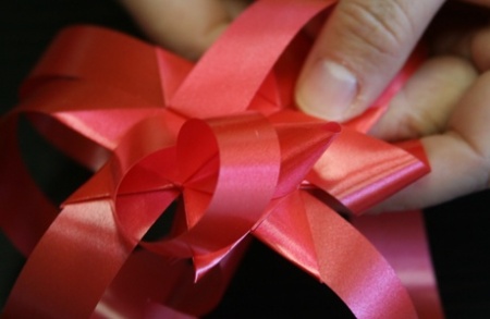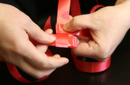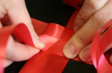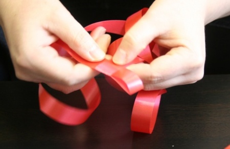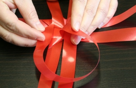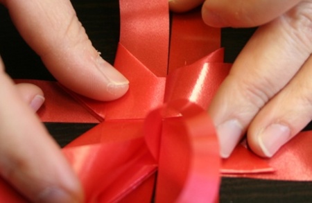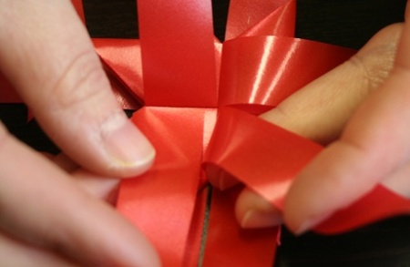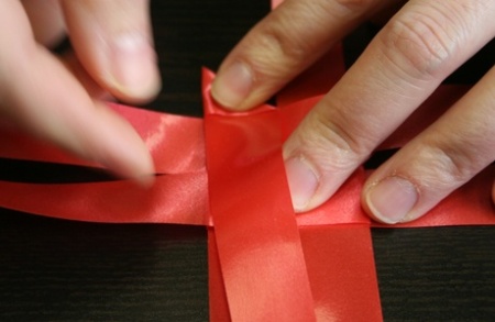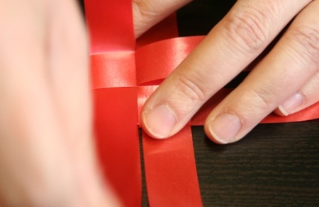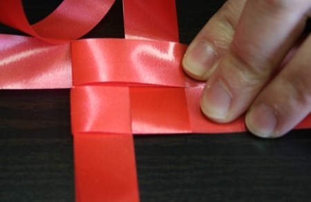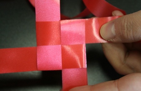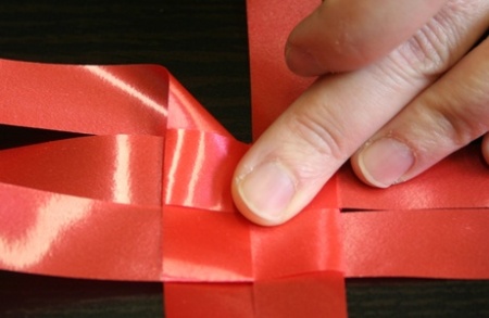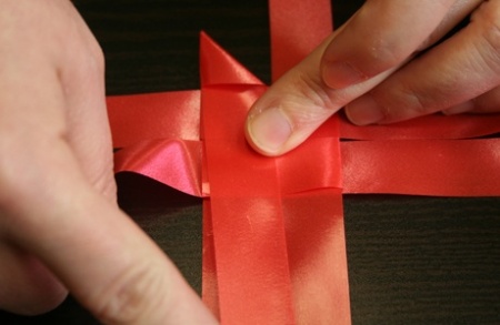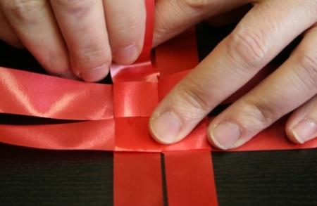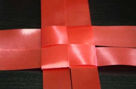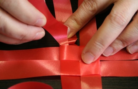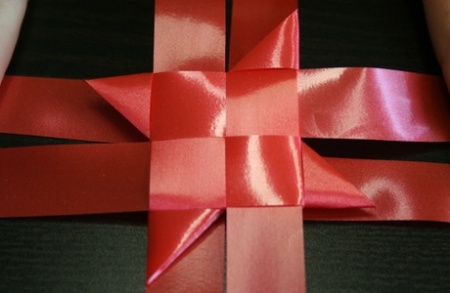 Ezután fektessétek le a szalagokat, és mindegyik szalag egyik szárát hajtsátok át szépen egymásra. A negyedik szalag végét dugjátok át az alatta lévő szalag alkotta hurkon, így már nem fog szétbomlani az egész.