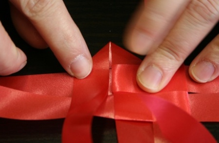 Miután a két háromszög egymásra került, a szalag szárát dugjátok át a lent látható módon a közvetlenül alatta lévő hurkon.