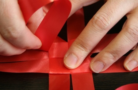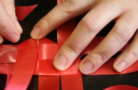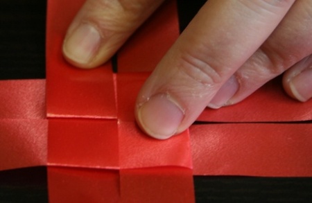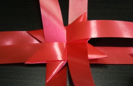 Ha mind a négy szalag félbe van hajtva, fűzzétek egymásba őket: az első szalagon egyszerűen dugjátok keresztbe a másikat, majd amit keresztüldugtatok, azon húzzátok át a harmadikat. A negyedik szalagnál cselesen kell eljárni, mert a felétek eső, merőleges szalag a belsejébe kerül, míg a két szárát át kell húznotok a tőletek távolabbra eső merőleges szalagon.
