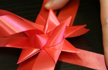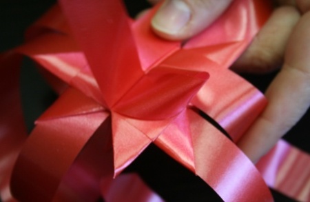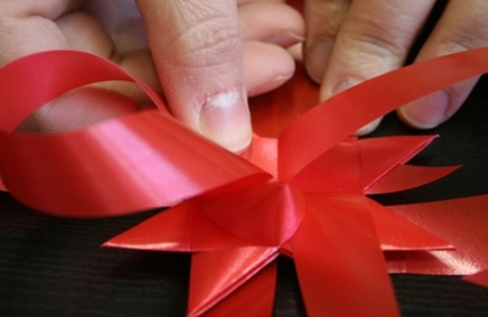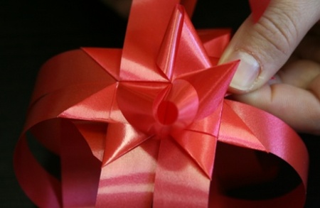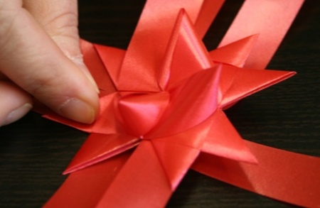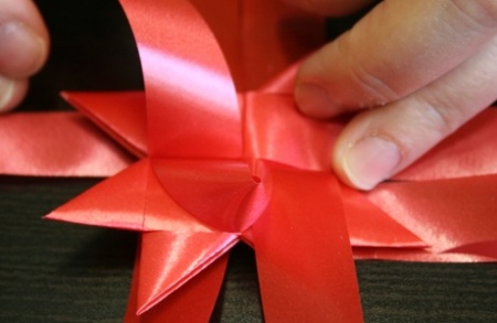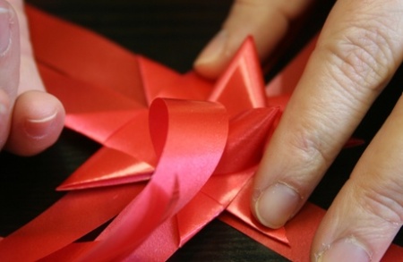 Az eljárást ismételjétek meg minden második szalagszárral! Ha megvan a négy fülecske ezen az oldalon, akkor fordítsátok meg a csillagot, és ismételjétek meg az eljárást minden második szalagszáron - persze azokon, amiknél még nincs fül!