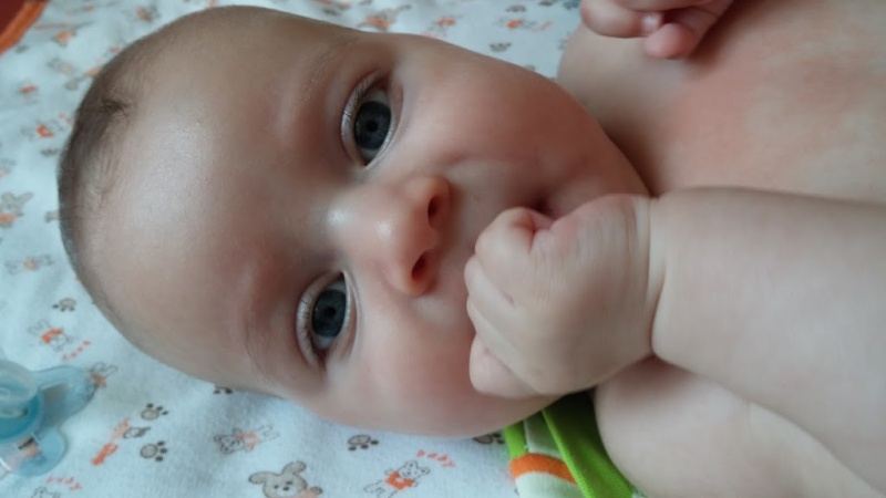 . Még nem jött ki a foga, néha szenved vele, de egyébként egy jókedvű, nagyon mozgékony baba, tegnapelőtt fordult át először hasra és hát egyre viccesebb hangokat ad ki