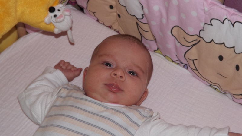 A szüléskor elég sok vért veszítettem, nem voltam túl jól, így a baba az első éjszakát a nővérekkel töltötte. A babának nem volt se légzési se más problémája szüléskor, és most sincs. Szép, édes, jó étvágyú baba.
